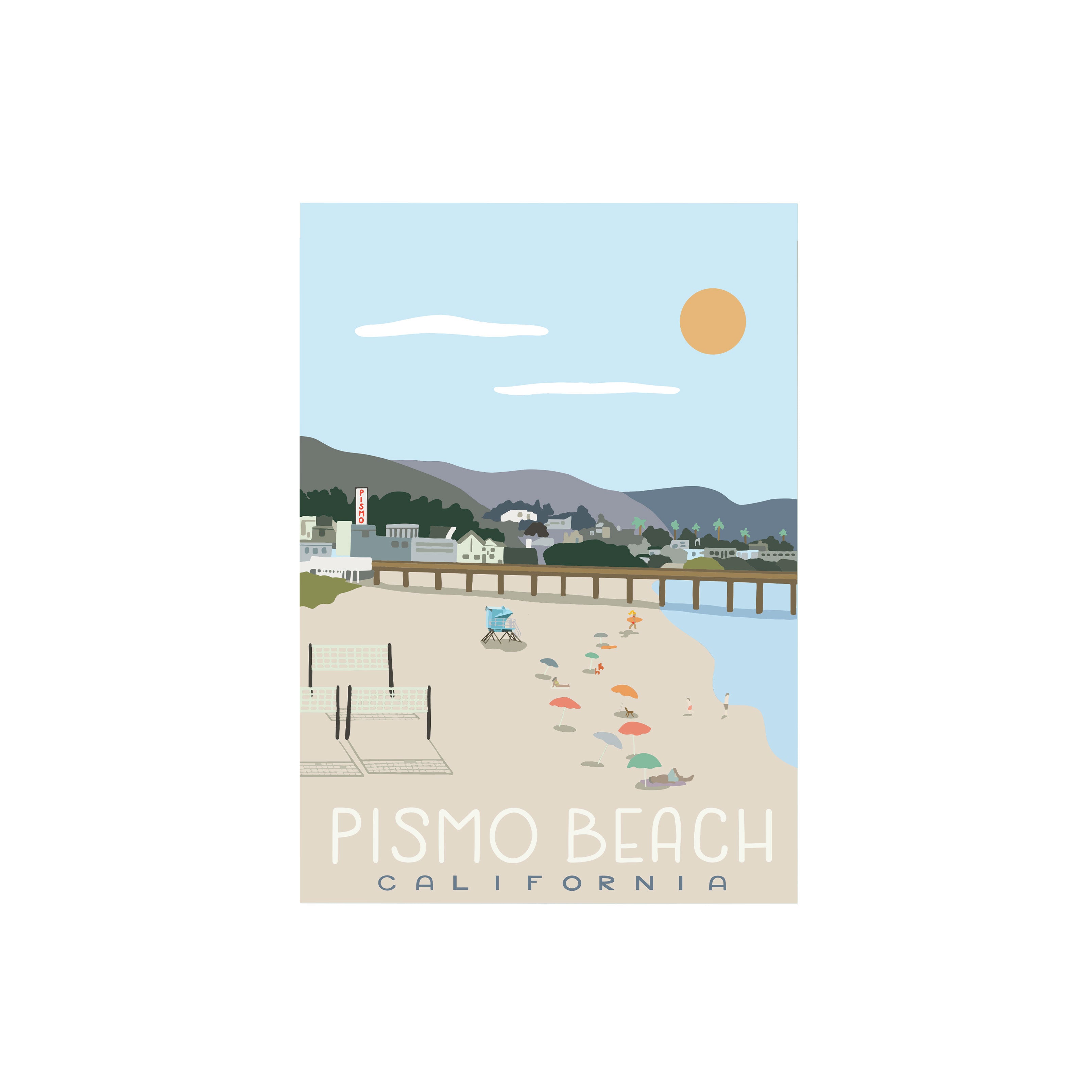 Celebrate the coastal charm of California's Central Coast with this sophisticated Pismo Beach illustration. This artwork captures the essence of one of the region's most beloved seaside destinations. Perfect for adding a touch of West Coast elegance to any space, this piece brings together artistic vision and local pride in a timeless composition.